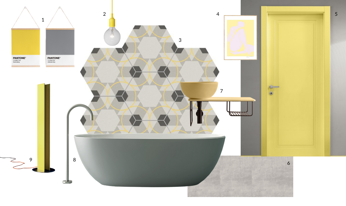 1. Poster Pantone 2021 Illuminating 13-0647 + Ultimate Gray 17-5104 [LapinMarket, € 5.89 cad.]; 2. Lampada a sospensione E27 [Muuto, € 69]; 3. Piastrelle esagonali in gres porcellanato 25x21,6 cm [Collezione Paprica, Marca Corona, € 45.40/mq]; 4. Poster Lilac Intimacy by Tiny Stories [The Poster Club, 50x70 cm, € 89]; 5. Porta con pannello laccato, Mixy versione PANTONE 13-0647 Illuminating [FerreroLegno, € 806]; 6. Rivestimento ceramico 35x100 cm, spessore 10,5 mm [Collezione Wallcraft, Panaria Ceramica, 55,51 €/mq]; 7. Struttura sospesa con lavabo in ceramica, modello Tile 65x36 cm, collezione OPI, Bagno di Colore [Ceramica Globo, struttura € 1.312,00, lavabo € 426,00]; 8. Vasca da bagno free-standing Wanda in tekno opaco, verniciato colore Elefante per esterno e bianco per interno, L 160 x P 70 x H 50,3 cm [Arbi Arredobagno, € 5.480]; 9. Radiatore free-standing T Tower, design by Matteo Thun & Antonio Rodriguez [Antrax IT, prezzo a partire da € 1421].