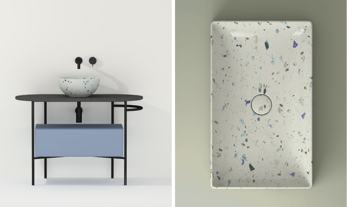 Effetto graniglia per il lavabo da appoggio linea T-Edge finitura “Le Pietre” (spessore bordi 6mm). Struttura mobile in tondino di metallo e piano d’appoggio in Dekton® disponibile in 3 differenti finiture (Angeletti Ruzza Design). Ceramica Globo (prezzo su richiesta).