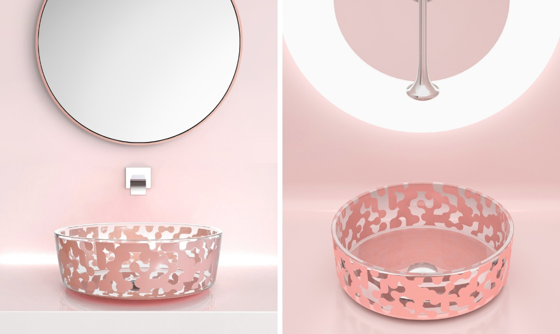 Lavabo da appoggio realizzato in vetro con decoro a serigrafia (misure 400x150 mm). La collezione Marea progettata dal designer Karim Rashid è disponibile in 5 differenti colorazioni: Lavender, Powder Pink, Sage Green, Sky Blue, Yellow. Glass Design (prezzo su richiesta).