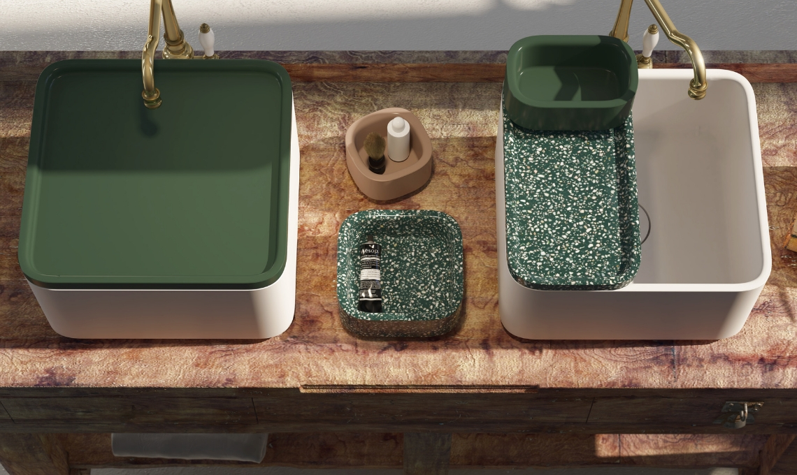 Collezione di lavabi da appoggio di diverse dimensioni con set di accessori coordinabili. Il gioco di incastri e geometrie permette infinite possibilità di configurazione cromatica e materica. Modello Choco (disegnata da ZeTae Studio). Relax Design (prezzo su richiesta).
