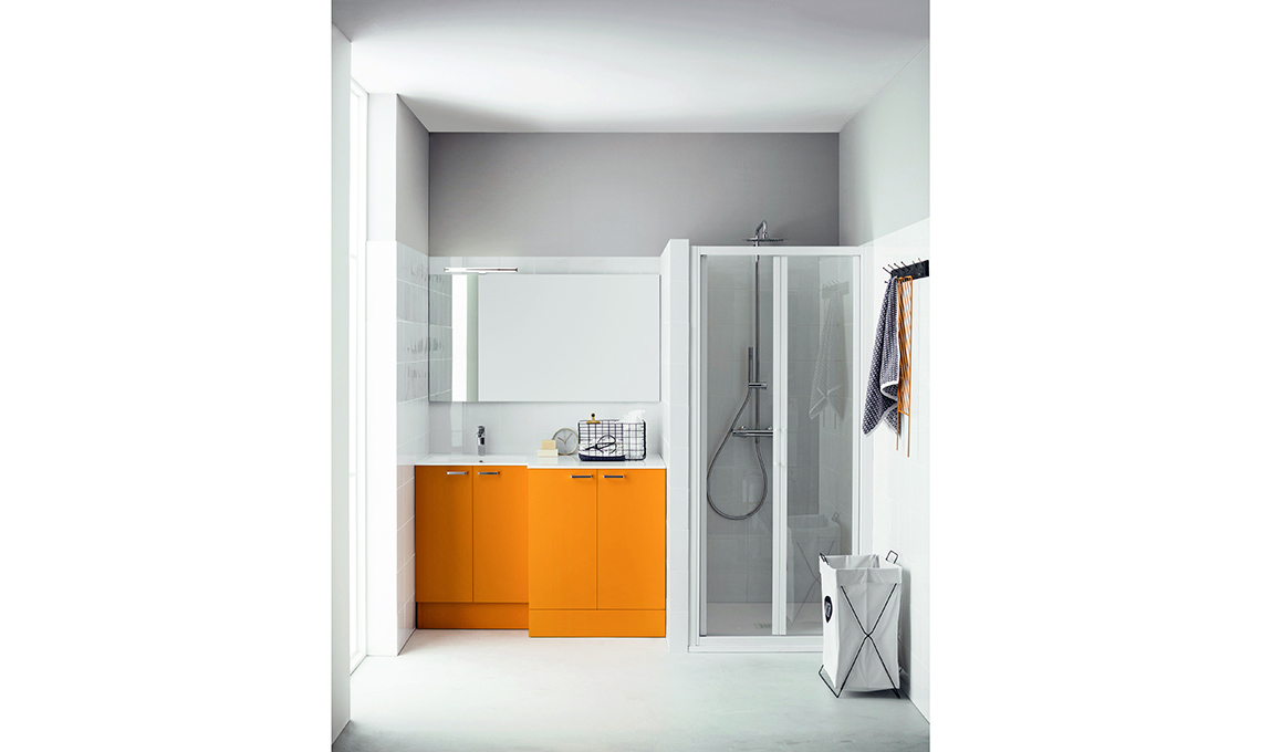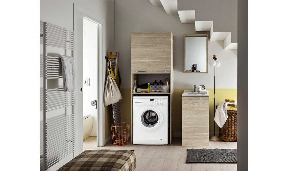 Si può installare un mobile a doppia profondità che accolga da un lato in lavabo (da usare anche per lavare i panni) e dall’altro la lavatrice nascosta dalle ante.