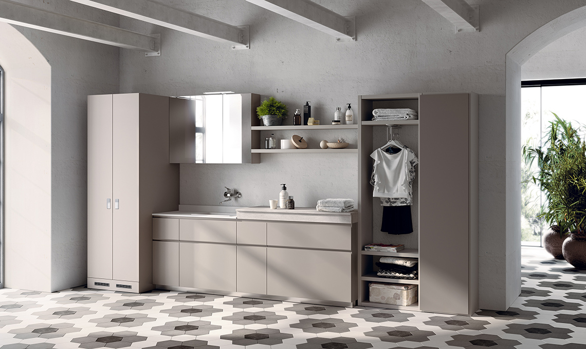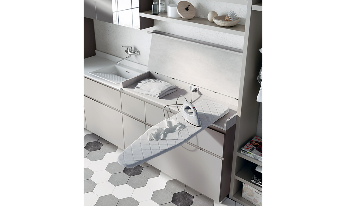 LaundrySpace con ante in Decorativo Grigio Selce, top in Mineralsolid® con lavatoio, moduli con stendino e asse stiro estraibili e colonna [Scavolini, prezzo su progetto].