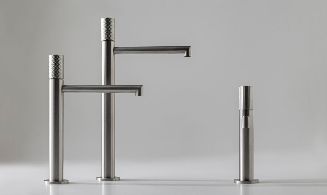 Un dettaglio prezioso è dato dal comando del miscelatore proposto in due texture zigrinate. 28mm è disponibile anche nelle finiture in pvd. Design Giampiero Castagnoli e Marco Pisati, Rubinetterie Treemme (prezzo su richiesta).