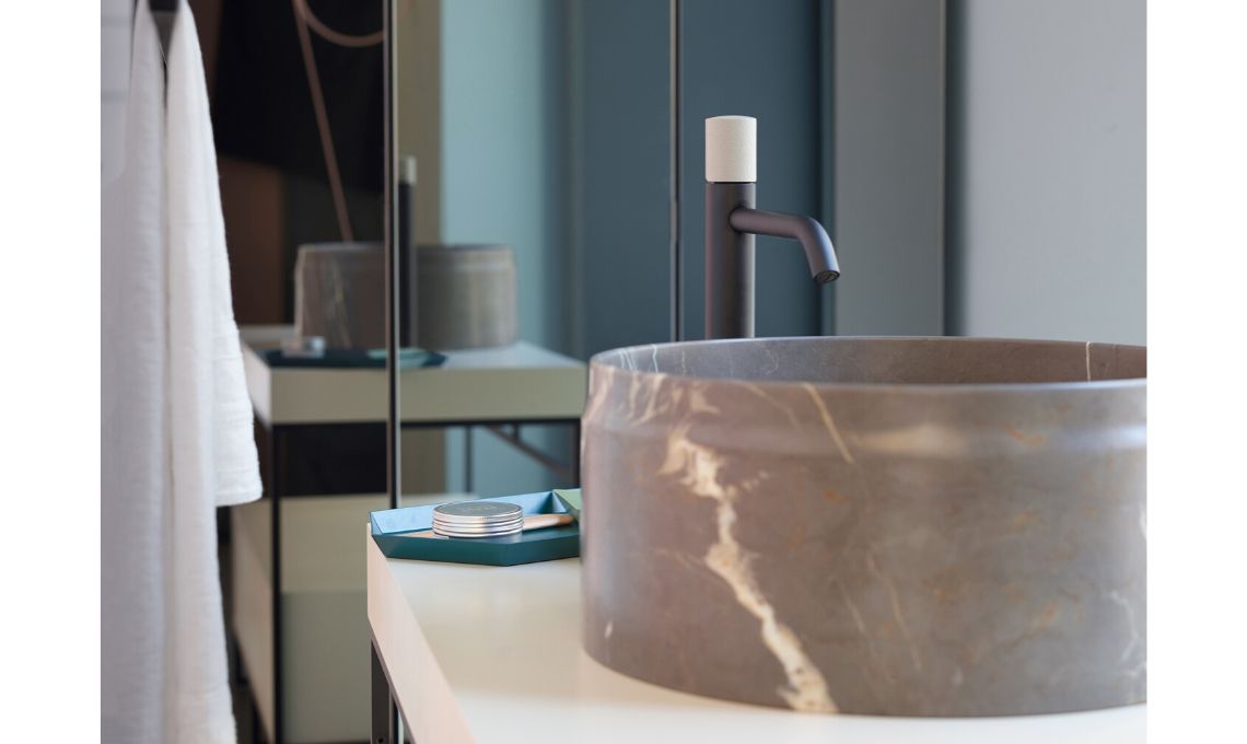Miscelatore SO di FIMA Carlo Frattini, qui proposto nella versione miscelatore monocomando nero opaco con manopola integrata nel corpo in finitura cemento grigio, che crea un raffinato effetto di contrasto. La collezione SO ha una vocazione green, la canna con un diametro di 10 mm limita la portata di erogazione dell’acqua.