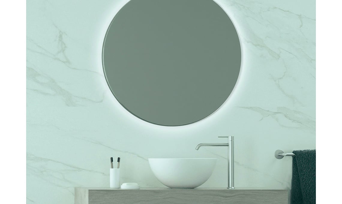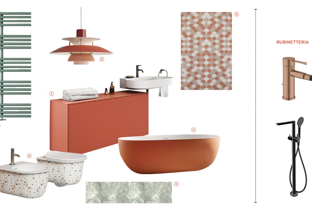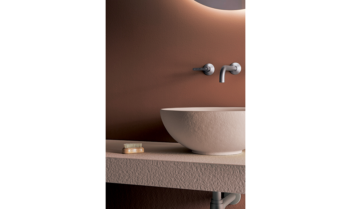 Total look effetto pietra. Per accontentare chi ama il colore e le texture ricercate c’è il sistema PietrabluTM che consente di realizzare superfici materiche di grande impatto tattile, sia sui lavabi sia sui top. Qui, Ciotola: composto da un mix di resine, ha lavorazione Trendy effetto pietra e poggia sul piano coordinato, tutto color cipria, ma disponibile in altri 43 toni e 4 finiture [Arblu, ø cm 42x16h].