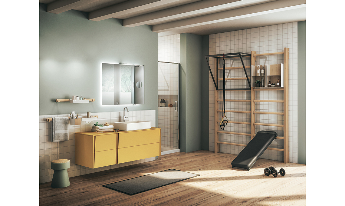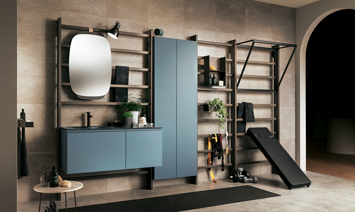 Iniziare la giornata con un po’ di ginnastica è l’ideale! Il sistema Gym Space ha struttura in multistrato legno scuro Core, ispirata alle spalliere delle palestre, a cui fissi gli attrezzi per allenarti, i mobili della coll. Juno, qui in laccato opaco Verde Ottanio con top e lavabo integrato in vetro lucido Grigio Ferro e anche specchi, mensole e luci [Scavolini].