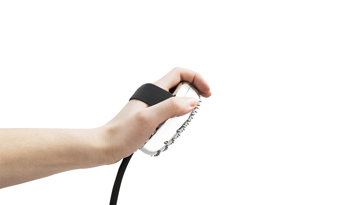Massaggi all'acqua. Design inedito per la doccetta WaterCandy che si impugna grazie alla cinghia. Ha 3 getti: pulsato, pioggia e combinato [Zucchetti].
