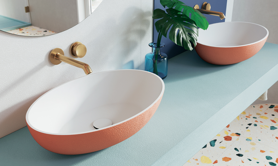 Total look effetto pietra. Per accontentare chi ama il colore e le texture ricercate c’è il sistema PietrabluTM che consente di realizzare superfici materiche di grande impatto tattile, sia sui lavabi sia sui top. In gallery, Ciotola: composto da un mix di resine, ha lavorazione Trendy effetto pietra e poggia sul piano coordinato, tutto color cipria, ma disponibile in altri 43 toni e 4 finiture [Arblu].