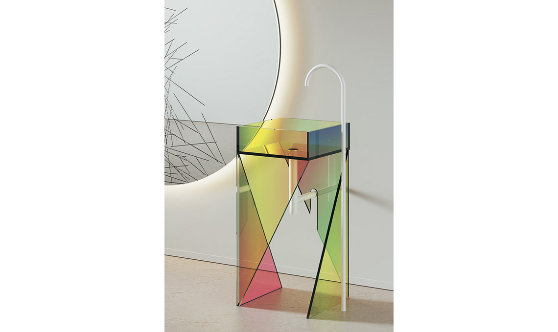 Cristallo cangiante. Di tendenza, il nuovo lavabo freestanding Dicroico è composto da lastre di vetro che inglobano una speciale pellicola ottica: interagisce con la luce cambiando colore a seconda del punto da cui lo si osserva [Artelinea].