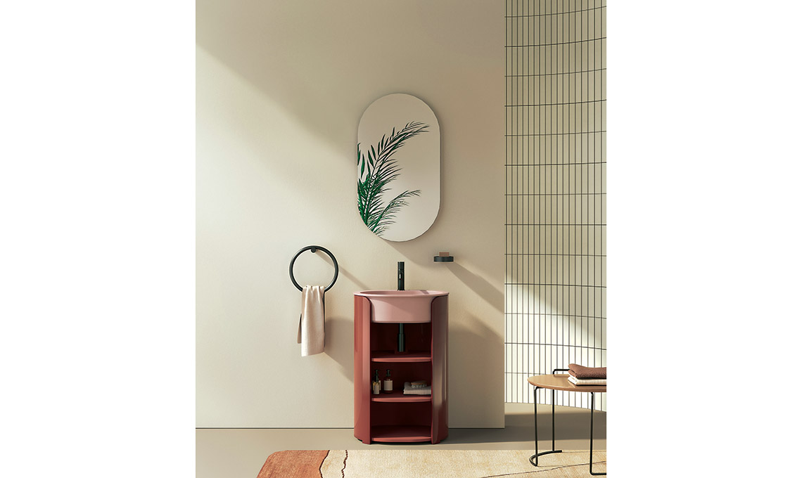 Compatto, pratico e colorato. Dedicato a chi non ama le soluzioni ‘canoniche’ e vuole un sistema lavabo salvaspazio: Tiberio, freestanding, ha il catino cipria, sostenuto dal modulo a giorno con tre ripiani in legno laccato corallo [Ceramica Cielo].
