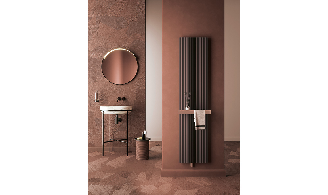 Effetto plissettato. Il radiatore Tessuto, ad acqua o elettrico, qui in color H56 Pietra Lavica, è composto da più elementi scanalati e assemblati in modo casuale, per ottenere una superficie dalla trama tessile sempre diversa e unica [Cordivari].