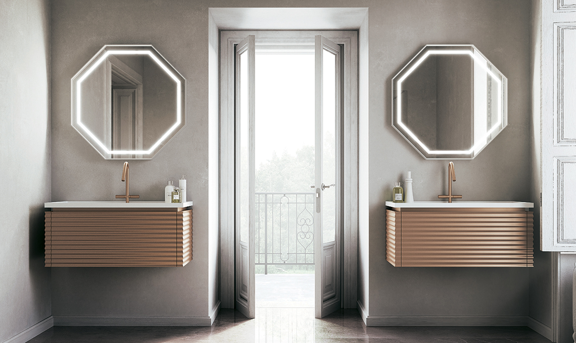 Superficie ondulata effetto metallo. La superficie scanalata del frontale e dei fianchi del mobile Dolcevita, qui nella finitura Laccato Metal Color Rame opaco, si ispira alla lavorazione artigianale ondulata del legno massello. Il lavabo è integrato nel piano in Aquatek Bianco [Idea Group].