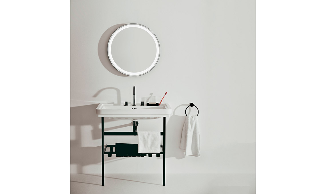 Ami l’idea di un lavandino rétro ma vuoi un effetto light? Puoi abbinare l’evergreen Calla alla console Conca in metallo e al rubinetto Joy, dalle linee contemporanee ed entrambi in finitura nera [Ideal Standard, cm 86,5x54x 90,7h].
