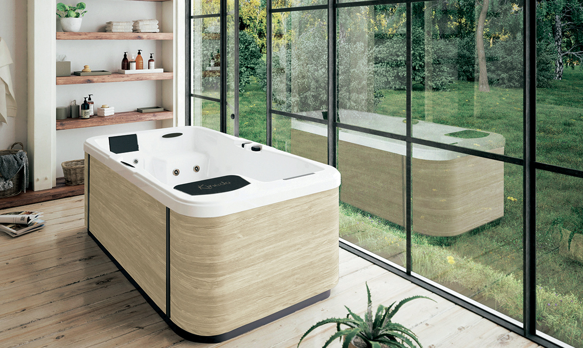 Minipiscina in & outdoor. Sta anche all’esterno la minipiscina A200 per 2 persone, con 2 tipi di massaggio (Avvolgente e Relax). Il rivestimento esterno è personalizzabile in 4 finiture di legno e l’interno in 4 colori [Kinedo].