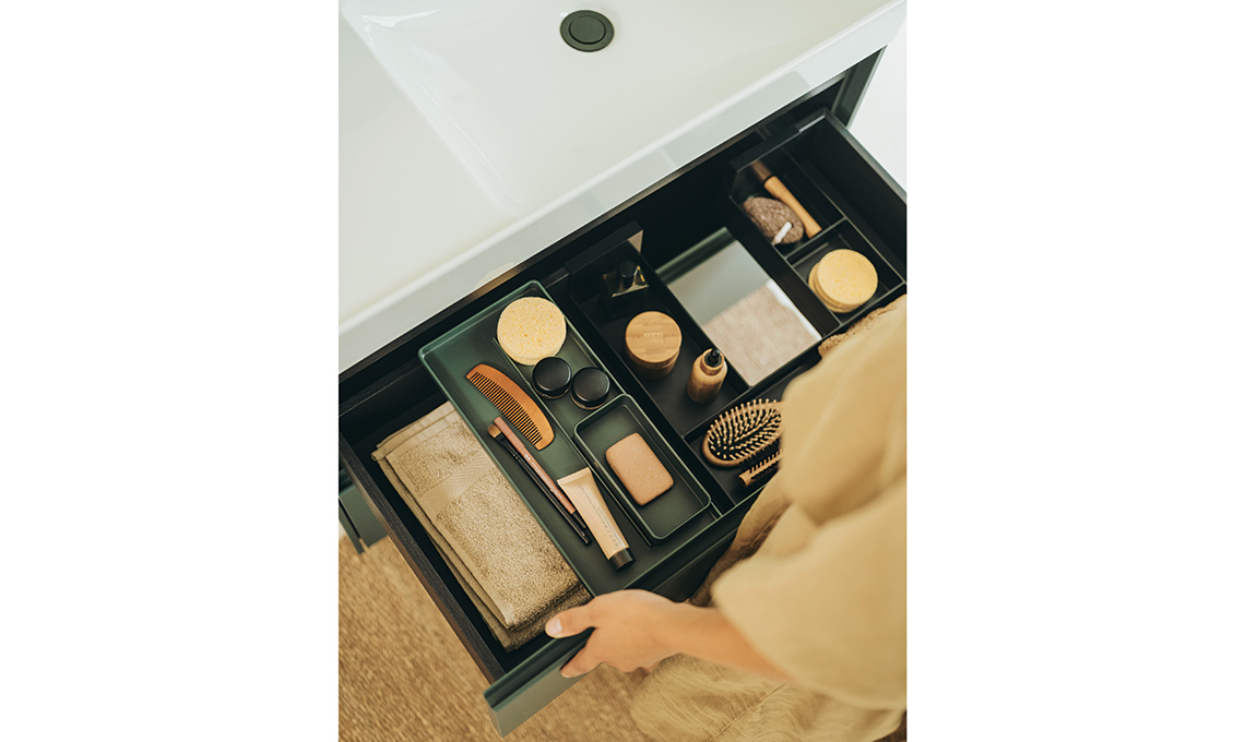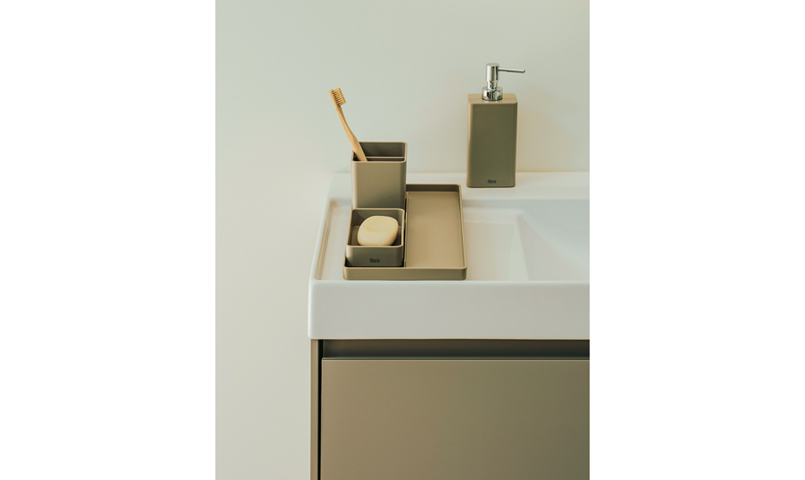 Vuoi un modo easy-chic per tenere tutto in ordine accanto al lavabo? Gli accessori Ona, in Abs riciclato, si usano sia sul top sia nei cassetti dei mobili della stessa serie. Qui, in verde opaco [Roca].