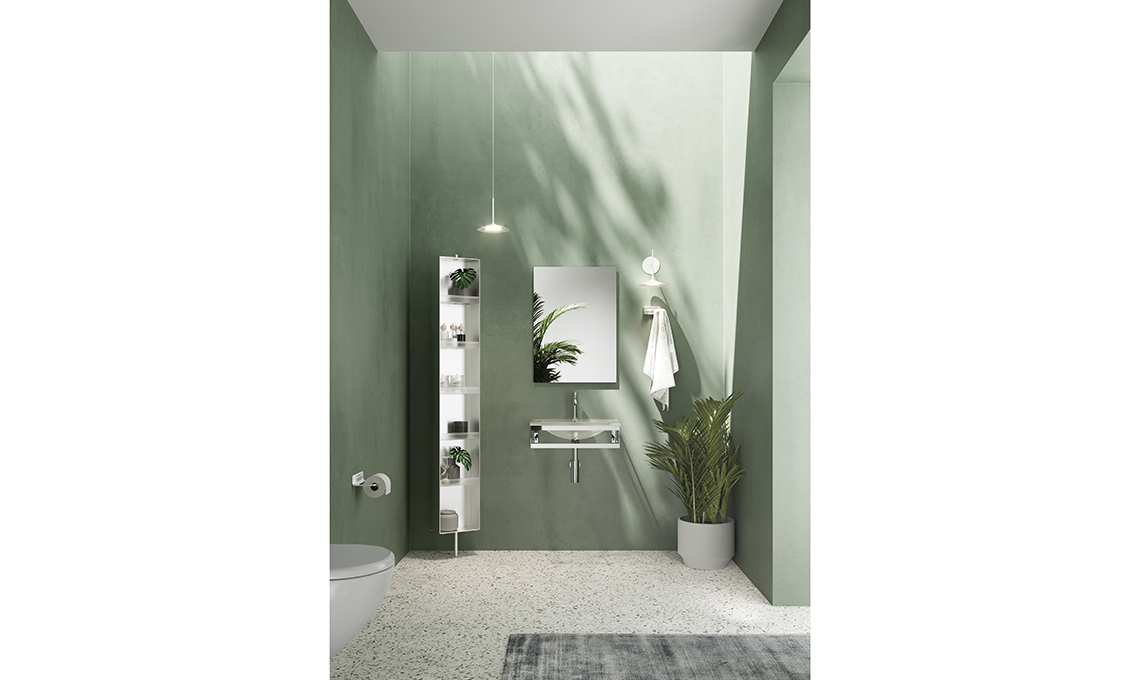 Lo spazio è sempre poco e i contenitori non bastano mai: la colonna rotante Pikà, da fissare alla parete, sfrutta l’altezza! Qui in acciaio finitura a specchio con ripiani, c’è anche in bianco, grigio o nero con mensole in vetro [Lineabeta by Samo, cm 25x26,5x183h].