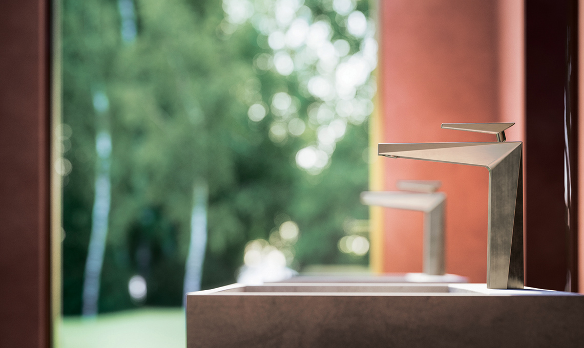 Fractal è il raffinato (e nuovo!) rubinetto monocomando che viene lavorato per ottenere un inedito profilo a prisma; levigatura, lucidatura e spazzolatura sono artigianali [Cristina Rubinetterie, cm 22,7h].