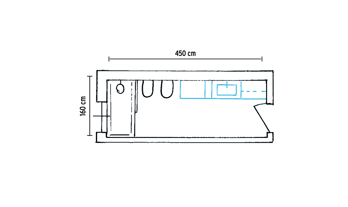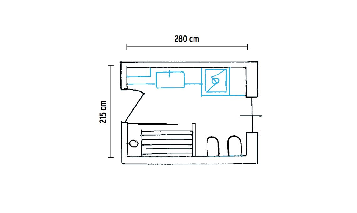 Su uno dei lati lunghi inserisci una parete con base con lavatoio, una colonna chiusa da ante per lavatrice e asciugatrice e una a giorno per detergenti e ferro da stiro; sul lato opposto wc e bidet più la maxi-doccia con stendino a parete.