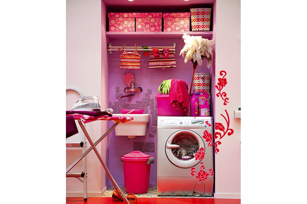 Ora puoi dare sfogo alla tua fantasia! Prendi degli stickers colorati a tema floreale e attaccali, partendo dalla lavatrice, per proseguire sul muro esterno tra la nicchia e le scope agganciate alla parete. Se ti diletti con la pittura dipingi (o fai dipingere) un decoro con due maxi-fiori in nuance con le tonalità già scelte, sul lato opposto a quello degli adesivi.