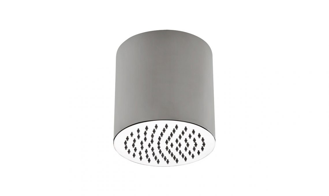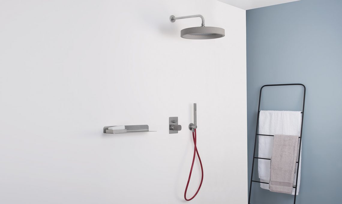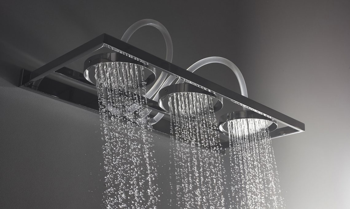 Nu ha 3 soffioni orientabili (ø cm 12 l’uno) per personalizzare la direzione dei getti a pioggia. In acciaio, con tubi light in silicone [Fima, cm 61x18h €1.812].