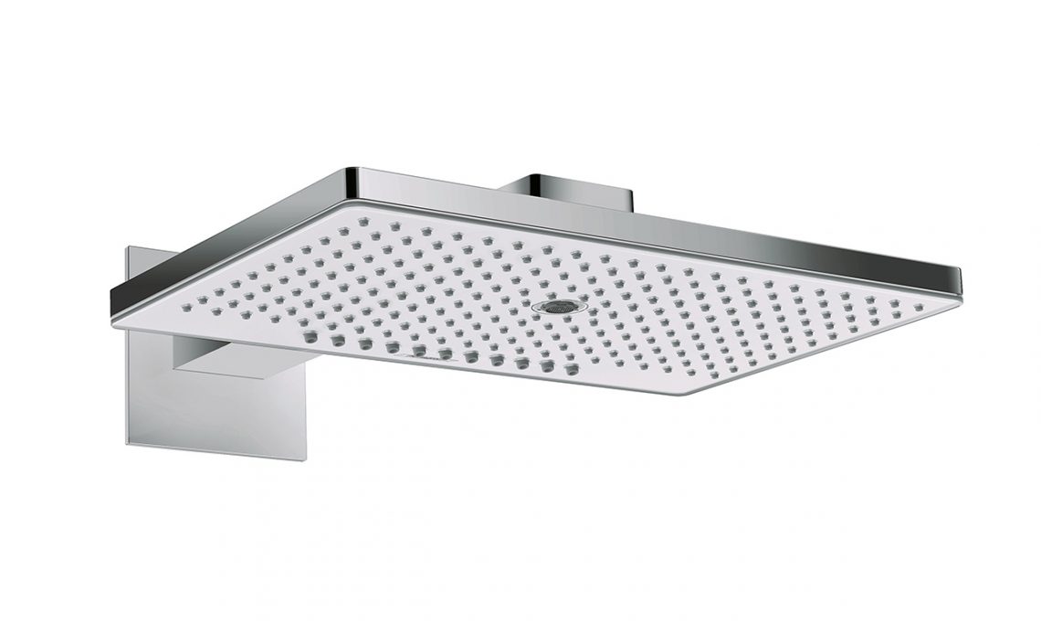Extralarge, Rainmaker Select ha il diffusore in vetro temperato bianco con 3 tipi di getto: delicato, intenso e centrale (per sciacquare i capelli). In più, il suo praticissimo erogatore va anche in lavastoviglie! [Hansgrohe, cm 46x30 prezzo su richiesta].