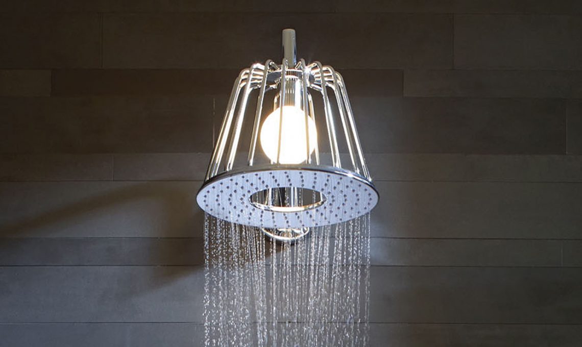 Ricorda i paralumi LampShower by Nendo Design, con Led e 120 ugelli QuickClean. Anche in finitura nichel, oro, bianco o nero [Axor, Ø cm 275x265h, qui cromo €1.700].