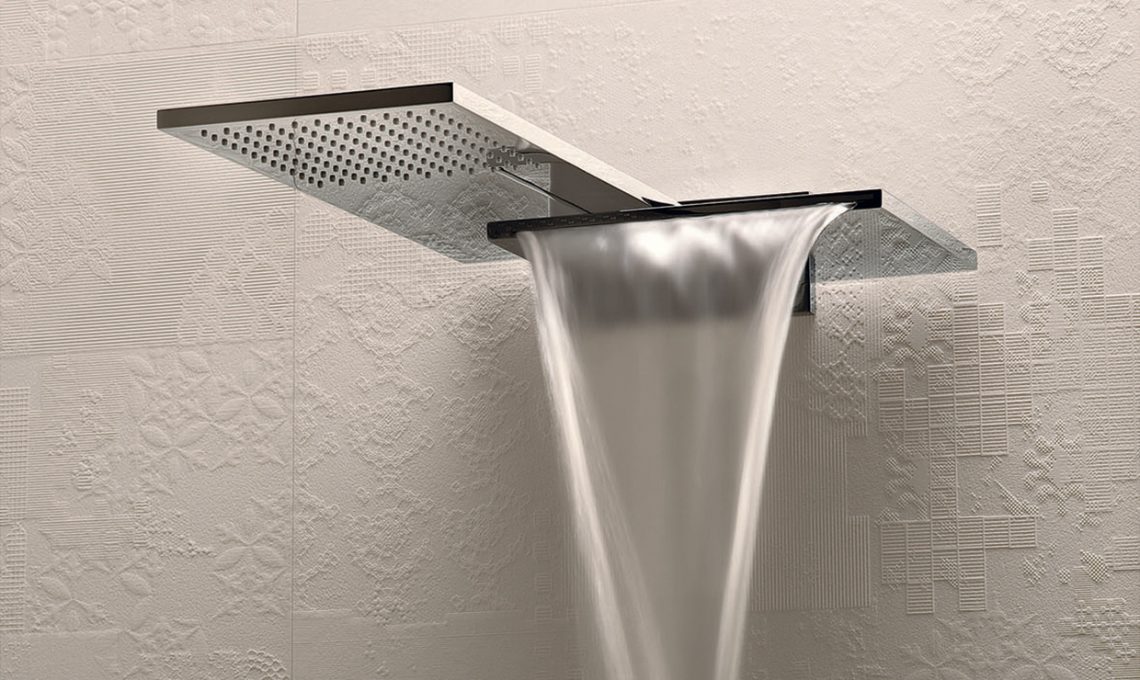 Il soffione Doppio Milano unisce al getto a pioggia, quello a cascata. Tutto si regola con il miscelatore termostatico a filo parete [Fantini, cm 35x49, prezzo su richiesta].