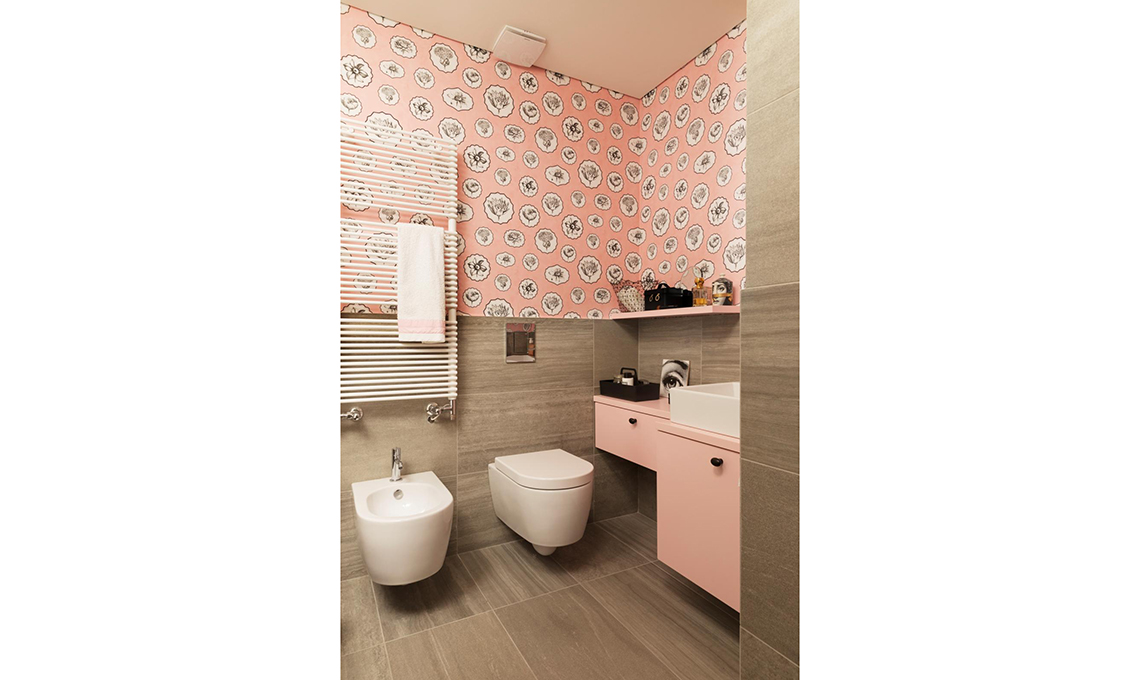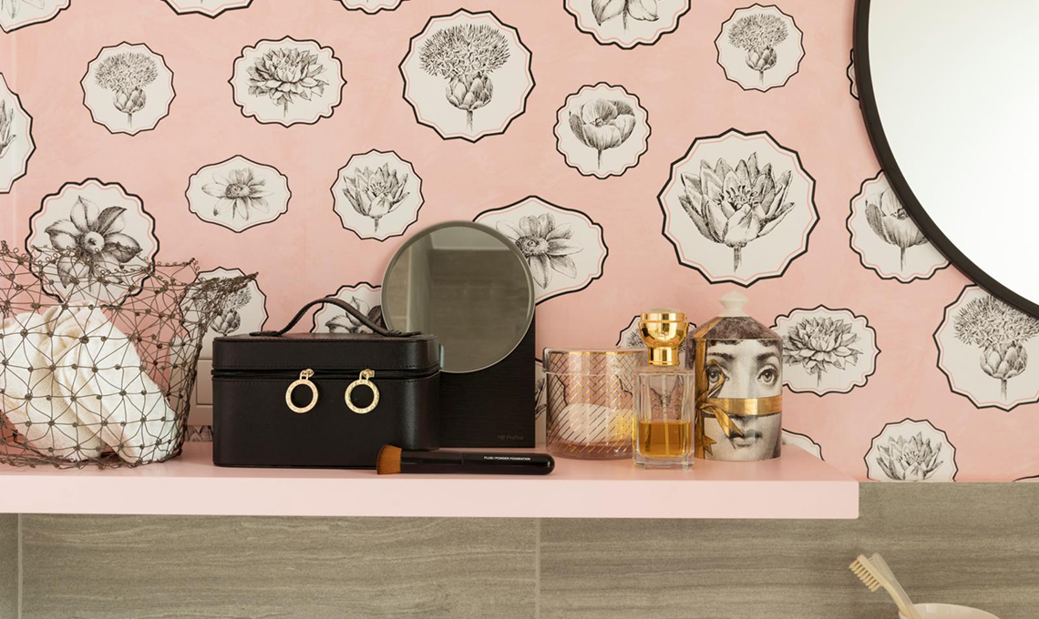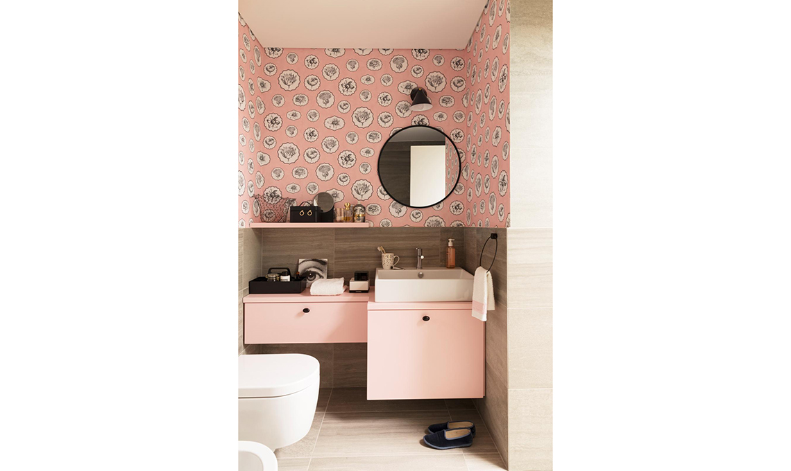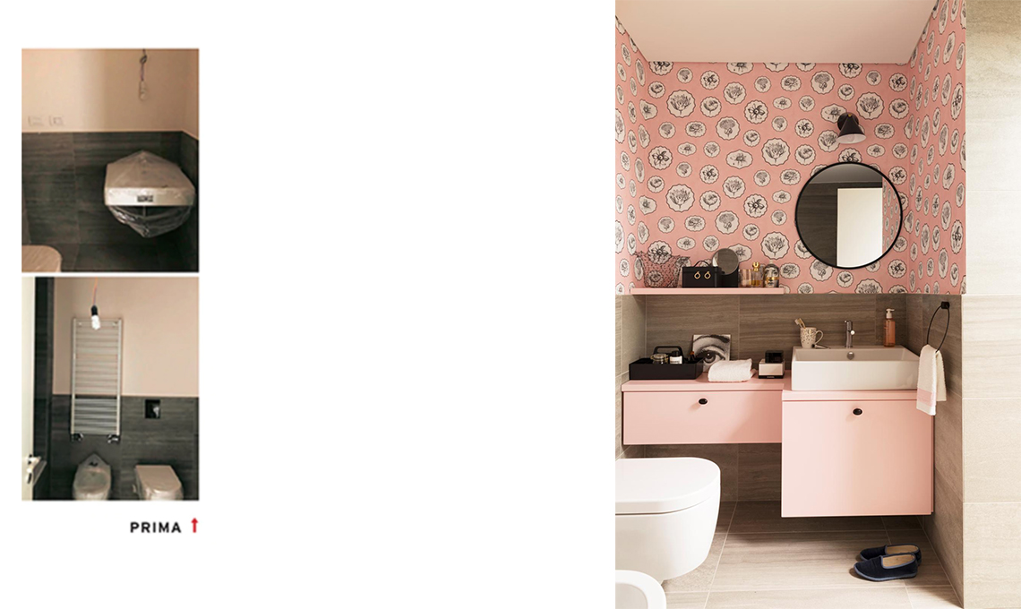 Vanessa è partita dalla tappezzeria a disegni botanici con un fondo rosa caramella: ha rivestito le pareti nella fascia al di sopra della boiserie in piastrelle. Riprendendo quel colore, ha fatto laccare il mobile sottolavabo realizzato su suo disegno e la mensola. Infine ha scelto accessori e lampada neri. Così il bagno anonimo è diventato super chic!