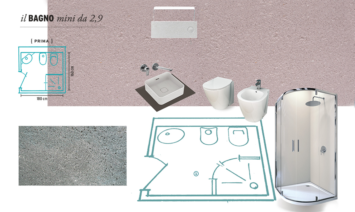 Sanitari a profondità ridotta, doccia angolare ma stondata con apertura centrale, lavabo freestanding posizionato a 45° e radiatore supercompatto. Sulle piastrelle esistenti si stende una resina cementizia.