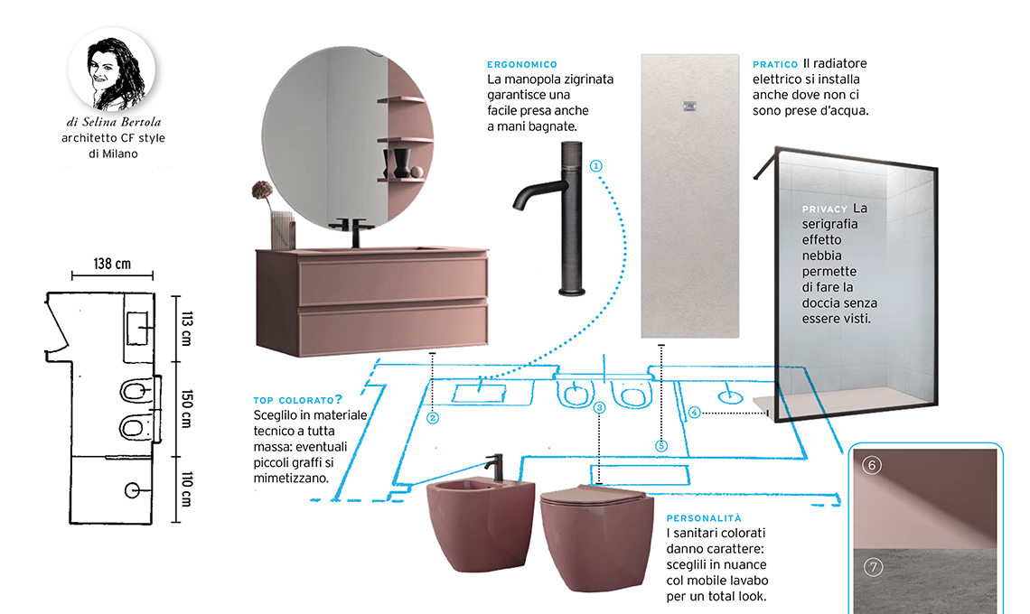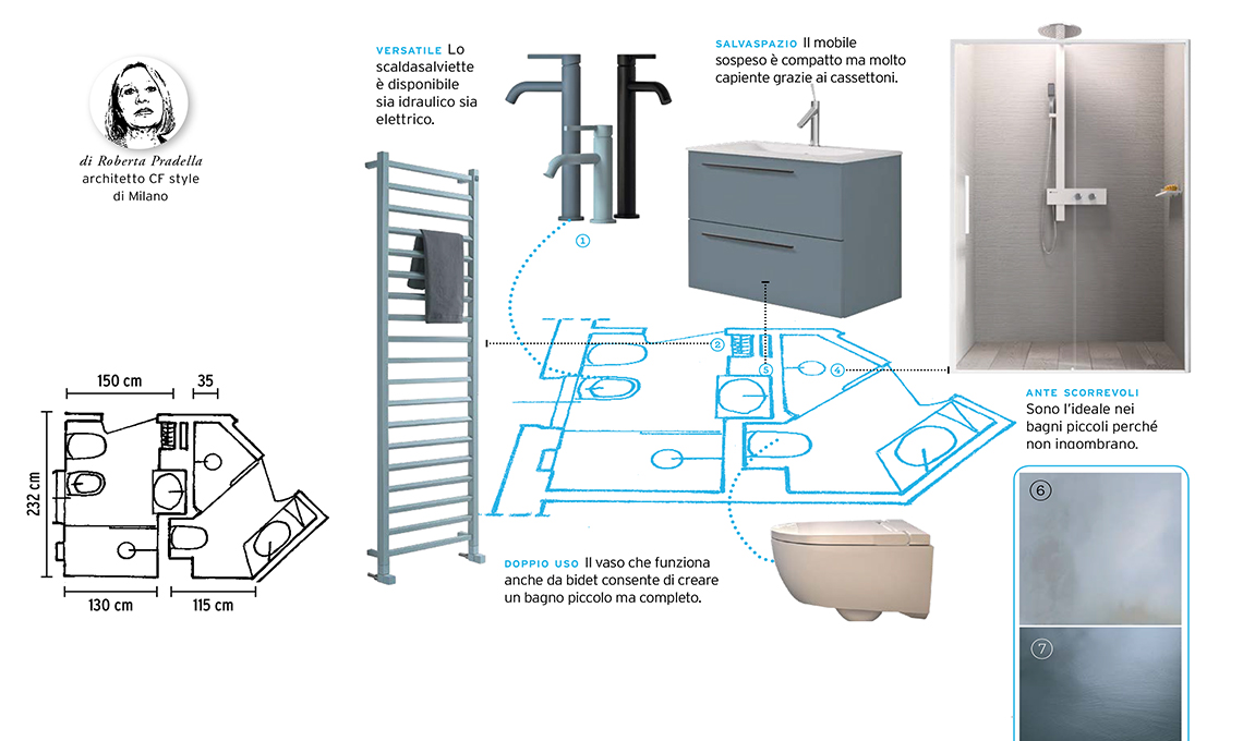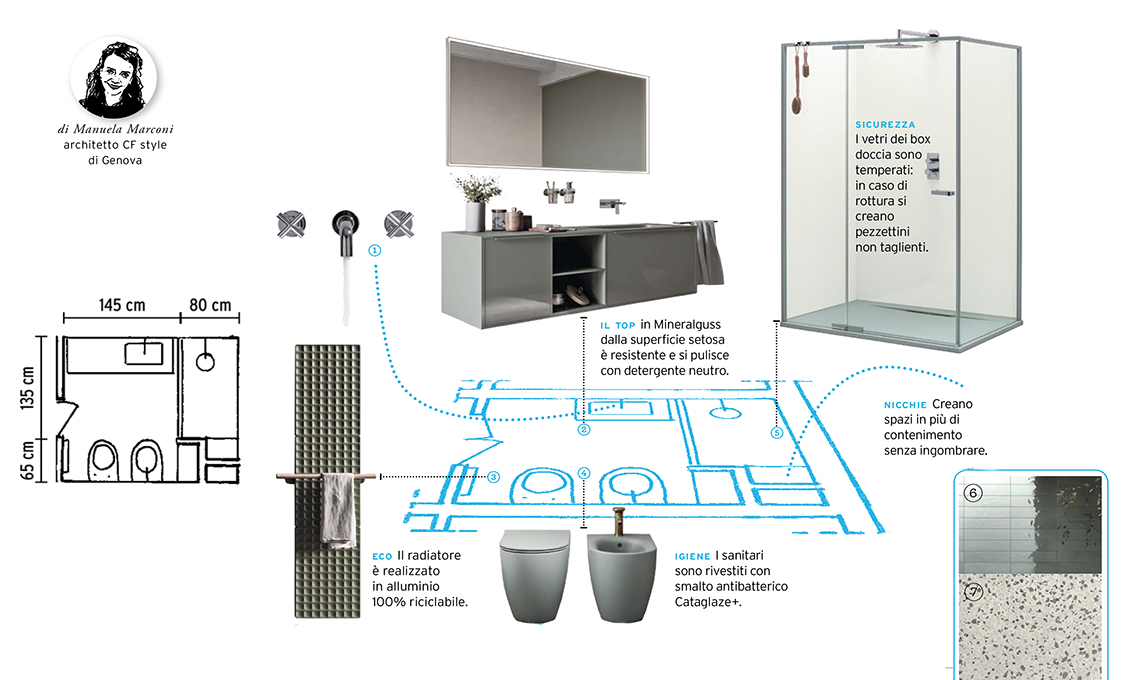 1 Miscelatori da lavabo Nova Fonte Pura in grigio e azzurro [Kludi, cm 19,5h]. 2 Scaldasalviette Twist azzurro chiaro [Deltacalor, cm 48x151h]. 3 AquaClean Alba è il vaso sospeso che grazie al sistema WhirlSpray è anche bidet [Geberit, cm 37,5x56,5x35,5h]. 4 Box doccia Riga con un’anta scorrevole e una fissa in linea con profili bianco opaco [Novellini, cm 160x200h]. 5 Mobile bagno sospeso Mia con base e cassetti avio più lavabo in ceramica [Leroy Merlin, cm 60x45x55h]. 6 Piastrella in grès Pearl Clear Sky dalla superficie nuvolata [Ricchetti, da cm 78,7x78,7]. 7 Rivestimento per pavimento in Cementoresina Color Collection KK 29 [Kerakoll].