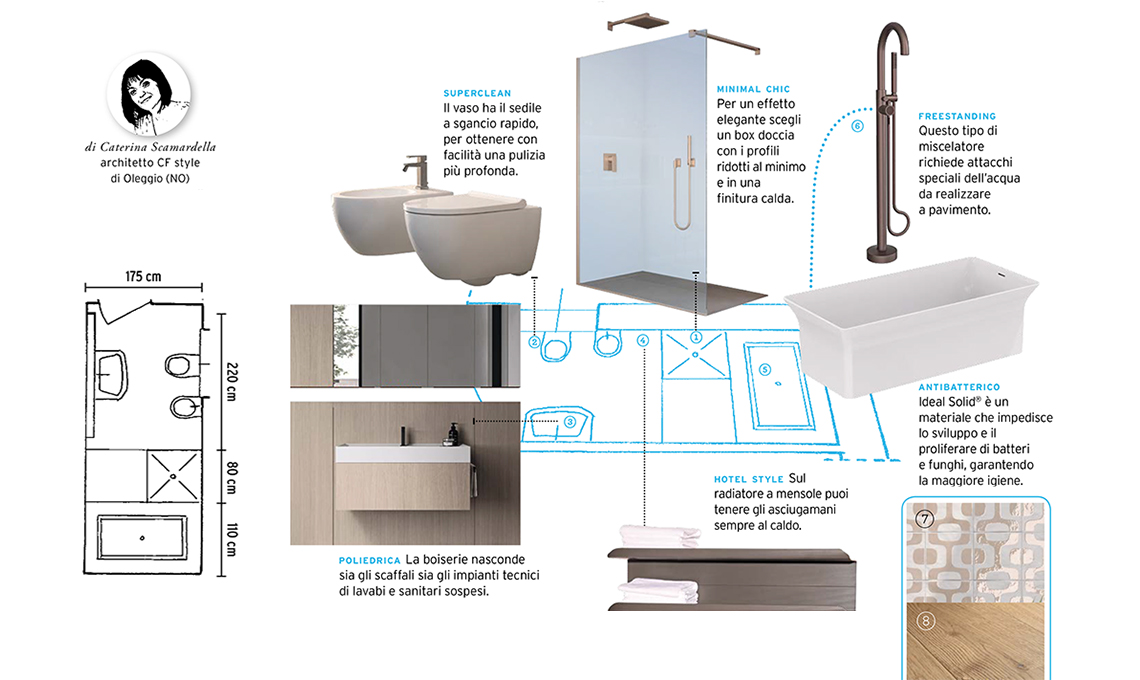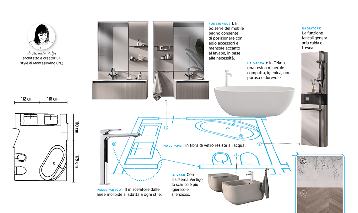 1 Mobili bagno Miko sospesi con basi ad ante in laminato Strips Urban Bronze abbinate al sistema Line System con schiena in laminato Urban Bronze con specchi e luci, top in vetro opaco Bianco Prestige con lavabo integrato Next [Scavolini, su progetto]. 2 Miscelatore alto Hask in finitura cromo [Treemme, cm 3,7x20,7x29,2h]. 3 Sanitari sospesi Neos Sabbia Essence [SDR, cm 35,5x56x42h]. 4 Run Vertical è il radiatore/fancoil accessoriabile [Cordivari]. 5 Vasca freestanding Wanda in tekno Bianco [Arbi Arredobagno, cm 160x70x50,3h]. 6 Wallpaper Willow in fibra di vetro [SpaghettiWall]. 7 Piastrelle in grès I Lecci Chevron [Serenissima, cm 9,6x56,6].