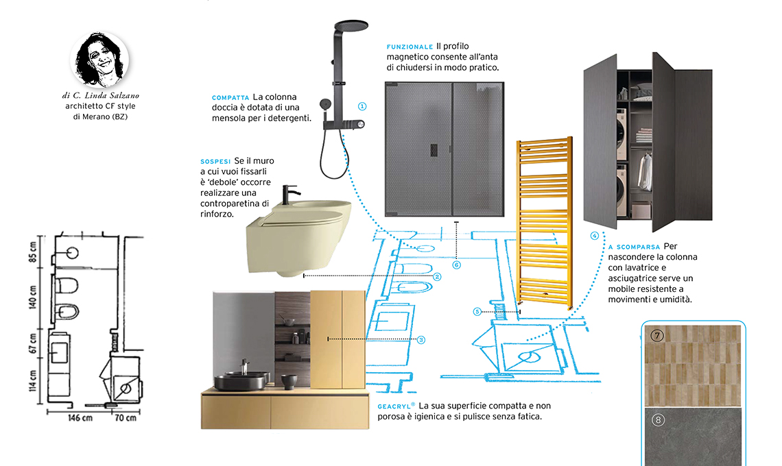 Inglobando meno di 1 mq della cucina adiacente, nell’unico bagno di casa è stata creata una nicchia profonda 70 cm da adibire a lavanderia. Mobile lavabo e sanitari sospesi (fissati a una paretina rinforzata) si sviluppano in linea sulla parete di fronte e la doccia da cm 150x85 è inserita sotto la finestra. Il giallo di pareti, mobili e sanitari dà carattere.
