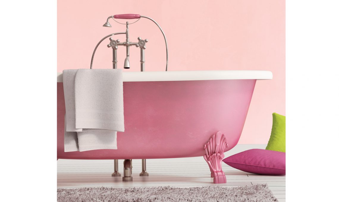 Pittura murale Rose Quartz 13-1520 [€29,90/2 litri]; per la vasca smalto Opera Mauve a tintometro, entrambi Collection inspired by Pantone di Max Meyer
