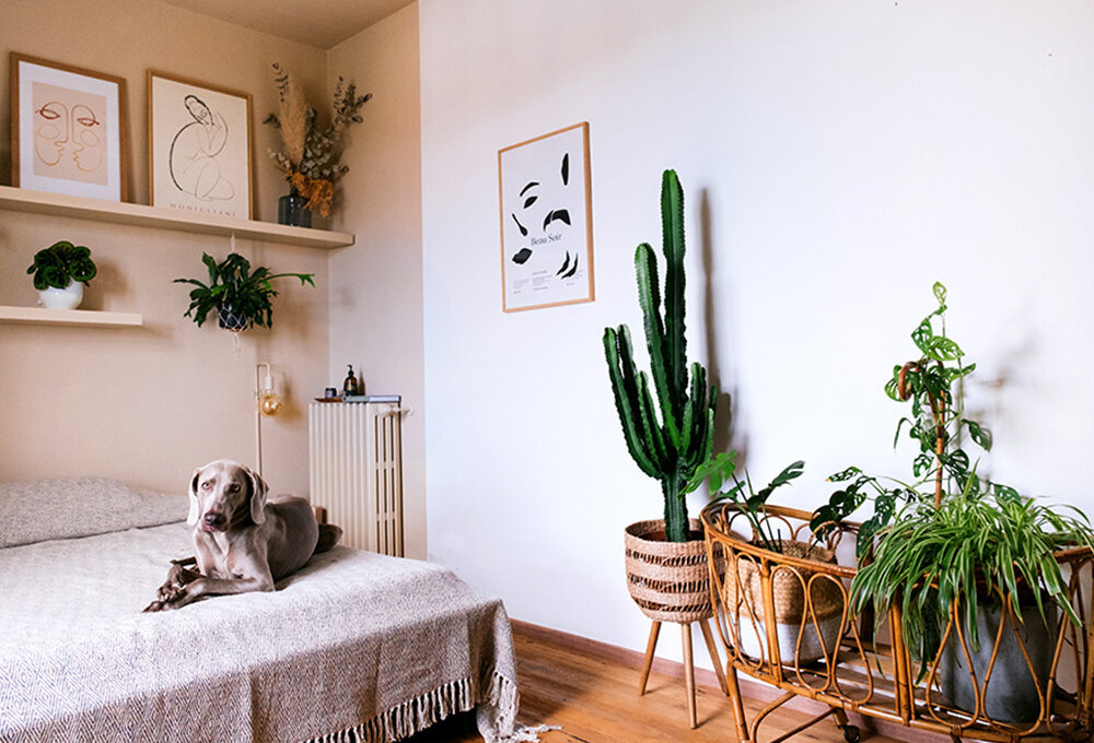 Quando lo spazio è poco, bisogna sfruttarlo anche in verticale. Io ho appeso mensole e bacheche dove annoto nuove idee per progetti creativi, ma che sono perfette per attaccare foto e poster. Per rendere più accogliente il mio angolo, ho aggiunto qualche pianta: una a terra, una appesa in un portapiante in macramè.
