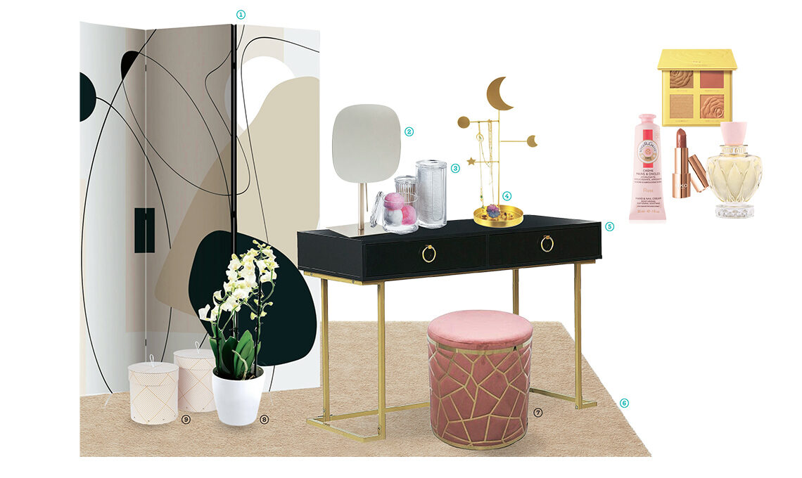 1. A tre pannelli il paravento Waves of Shapes, in legno rivestito di carta a stampa grafica [Bimago, cm 135x172h € 100]; 2. Ideale per il trucco lo specchio Chic con ingrandimento [Casa, cm 17x11,5x28h € 18,95]; 3. In plastica e in tre misure i pratici contenitori con tappo [Domopak Living € 13 il set da 3]; 4. Espositore portagioielli funzionale e decorativo con le silhouette della luna, Celestial in metallo con finitura oro [Sass & Belle, cm 35h € 17]; 5. Console con due cassetti e base metallica in finitura ottone, Westport [Beliani, cm 115x50x77h € 250]; 6. Morbido e confortevole il tappeto Stoense [Ikea, cm 195x133 € 59,95]; 7. Una gabbia metallica oro decora il pouf in velluto cipria [Brandani, ø cm 35x37h € 79,90]; 8. Nel vaso in ceramica l’orchidea bianca [Flob, ø cm 9x35h € 25,90]; 9. Carta con dettagli metallici per le scatole con coperchio Hanna [Bigso Box of Sweden su Westwing € 23 la coppia]; 10. Make-up nel loro packaging rétro: palette per occhi e viso e rossetto [Kiko da € 13]; crema per le mani alla rosa [Roger&Gallet € 4,90]; eau de toilette Twist [Miu Miu da € 80].