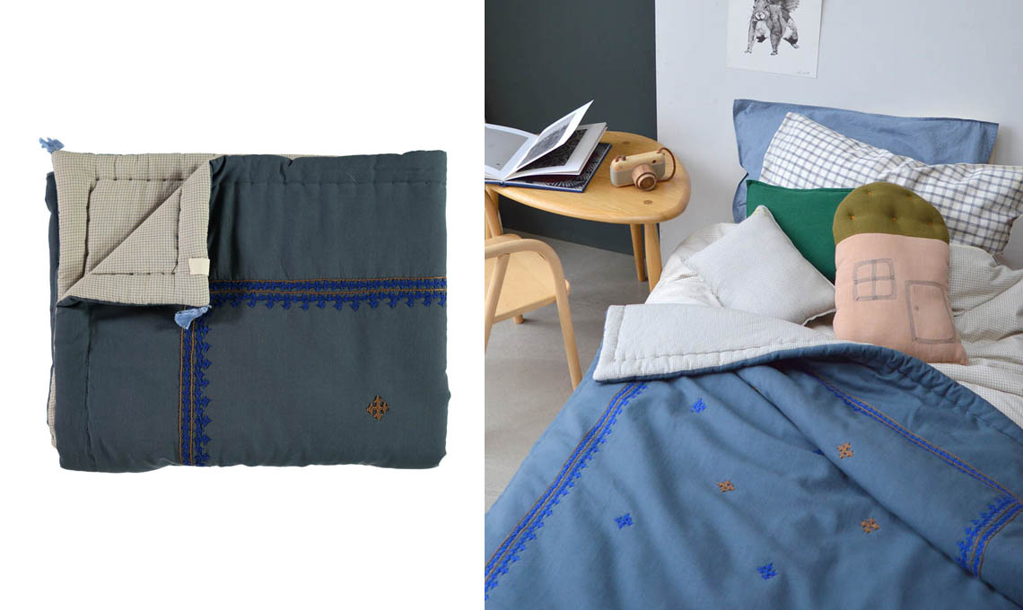 Una bellissima e particolare coperta in cotone in edizione limitata e realizzata in due varianti, blu o beige. La coperta è double-face ed è leggermente imbottita.