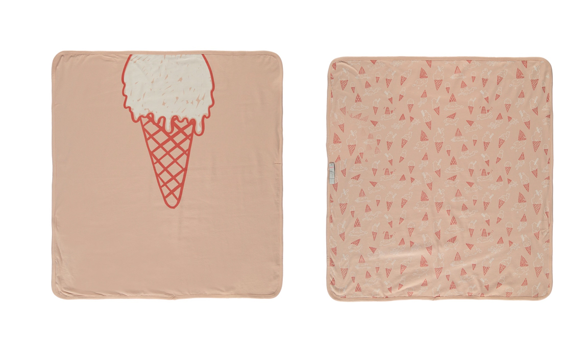 Questa piccola coperta è l'ideale per l'ora del sonnellino. Disponibile in due colori: rosa e azzurro/grigio ha una grande gelato disegnato sulla parte superiore. Anche questo modello è double-face.