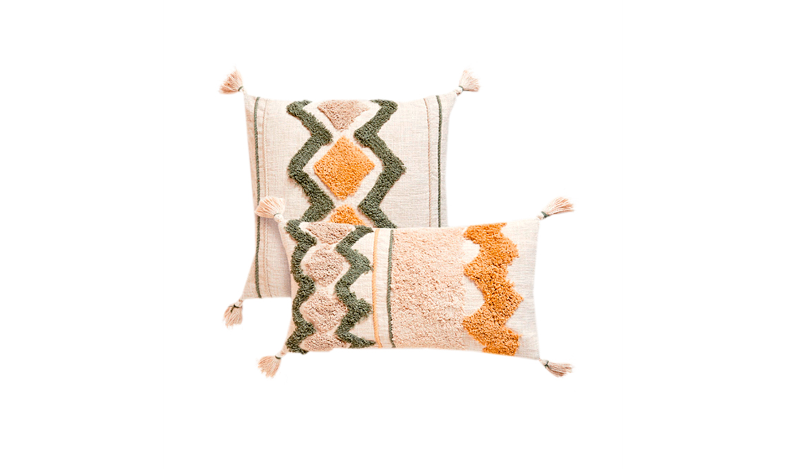 Cuscini Nazca in velluto decorati con applicazioni ricamate in panna e petrolio [Fazzini, cm 30x50]