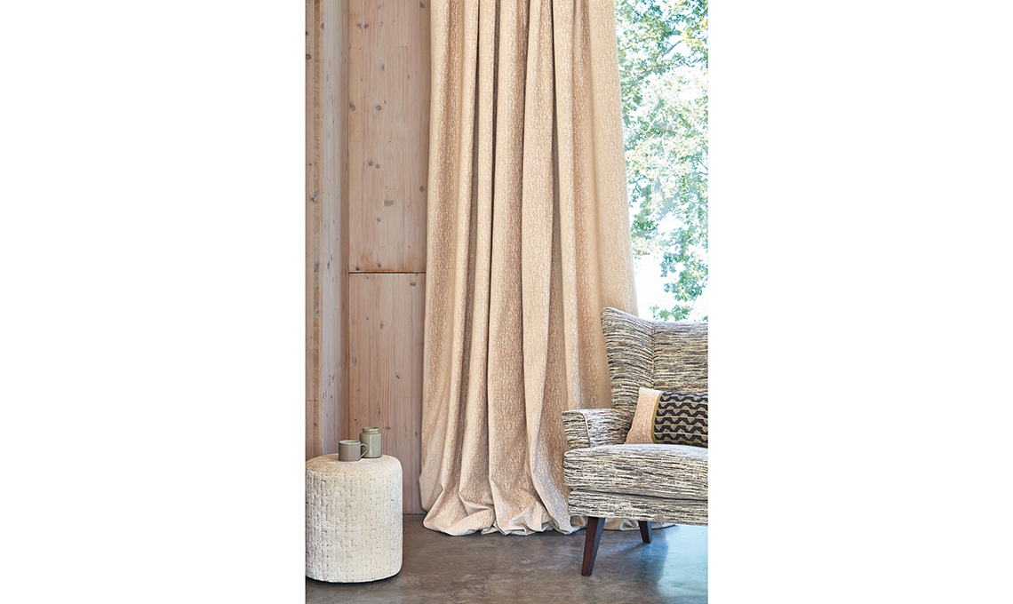 Trame dalla texture moderna, con leggere geometrie incise su un tessuto brillante. La coll. Artesia Weaves mixa la lucentezza del velluto alla morbidezza della ciniglia [Villa Nova, cm 137h €87,50/m].