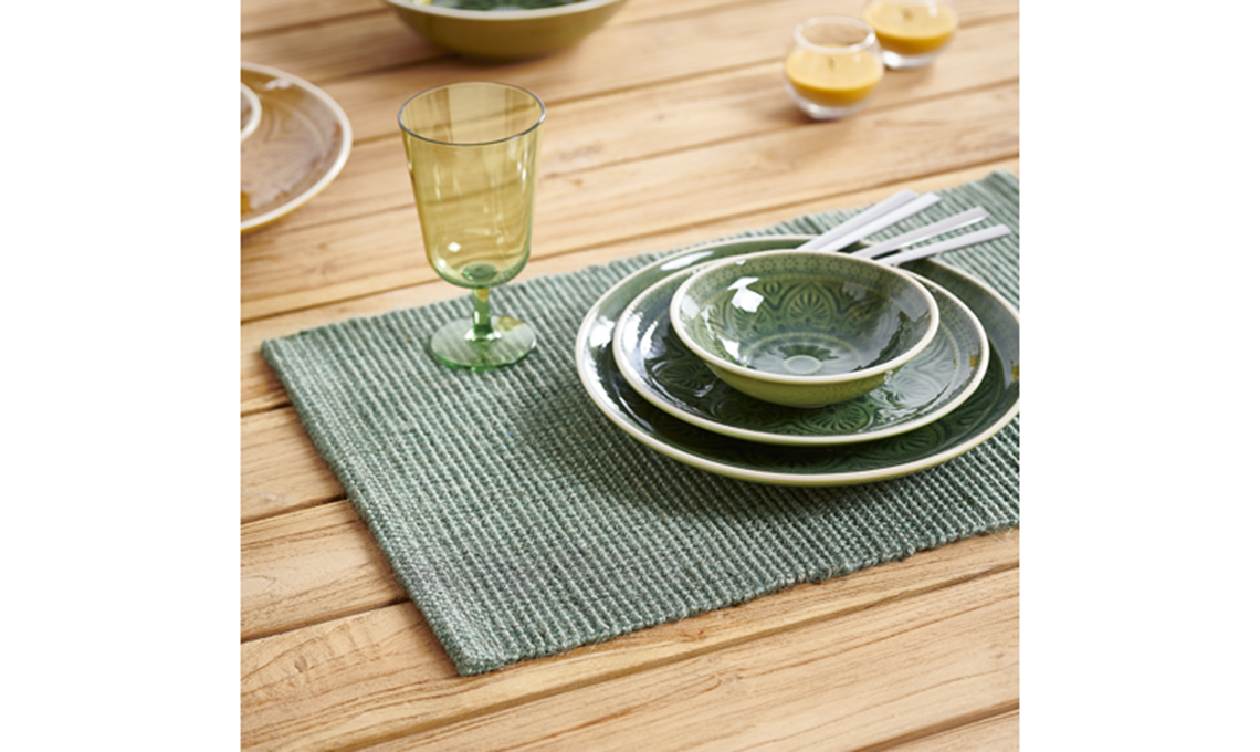 Tovaglia in lino [Romo], tessuto Filodendron [Ikea], tovaglioli [Milou Milano], piatti [Bormioli Rocco e Waiting for the Bus], posate [su Amazon].