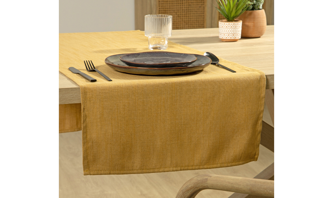 Lino ‘lavato’ per una tavola ricercata ma informale: la tovaglia ideale è Victorine 100% lino, qui ocra [La Redoute da cm 170x170 da € 54,99].