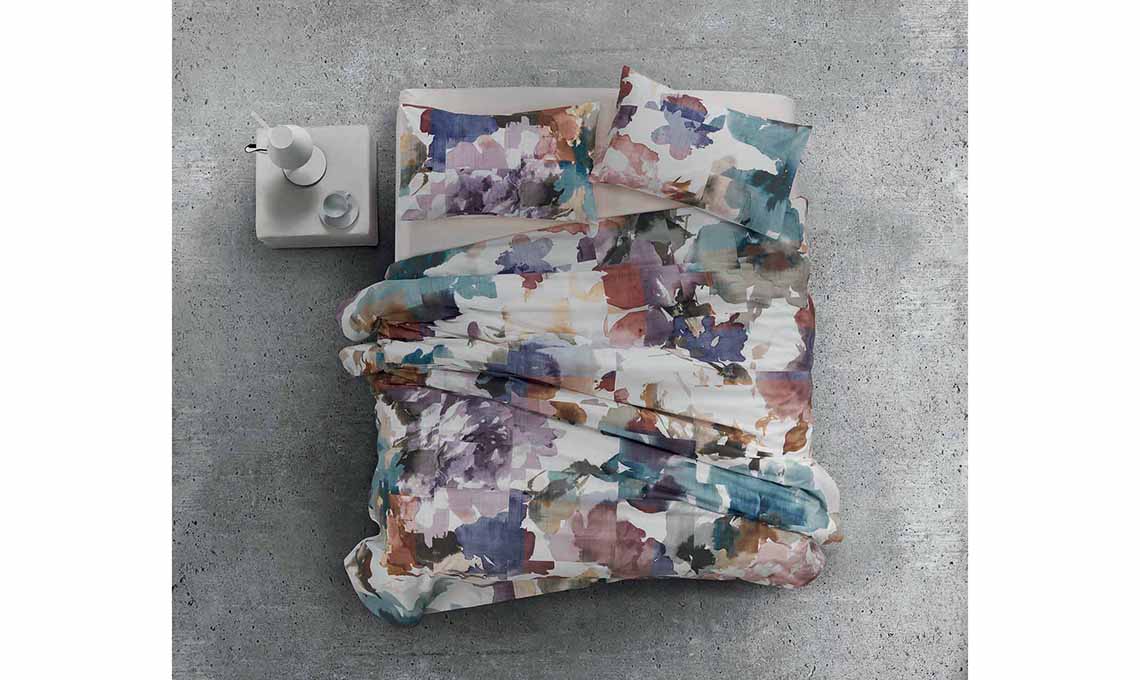 Trapunta Cascata di Fiori in cotone con stampe di ispirazione vegetale, federe e copriletto tricot [Caleffi da € 155].