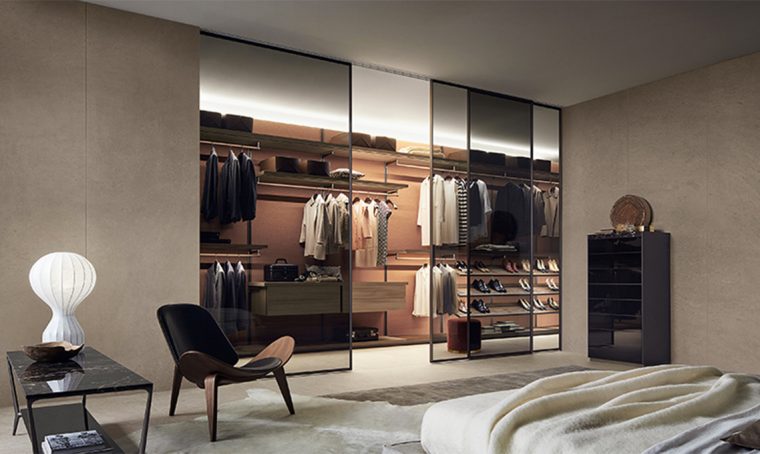 Alterna con ante scorrevoli Mondrian e Compass Cashmere con profili bruniti [Zalf, cm 402,5x61,2x259,2h]