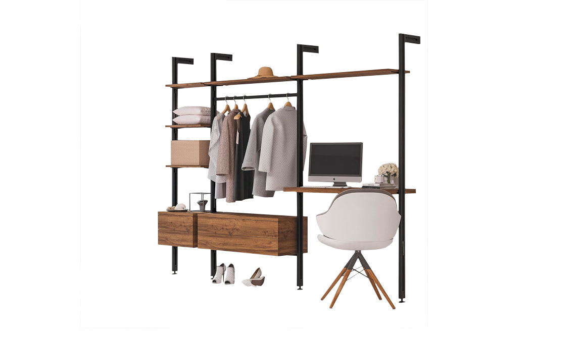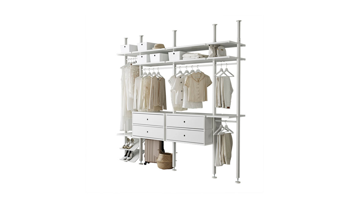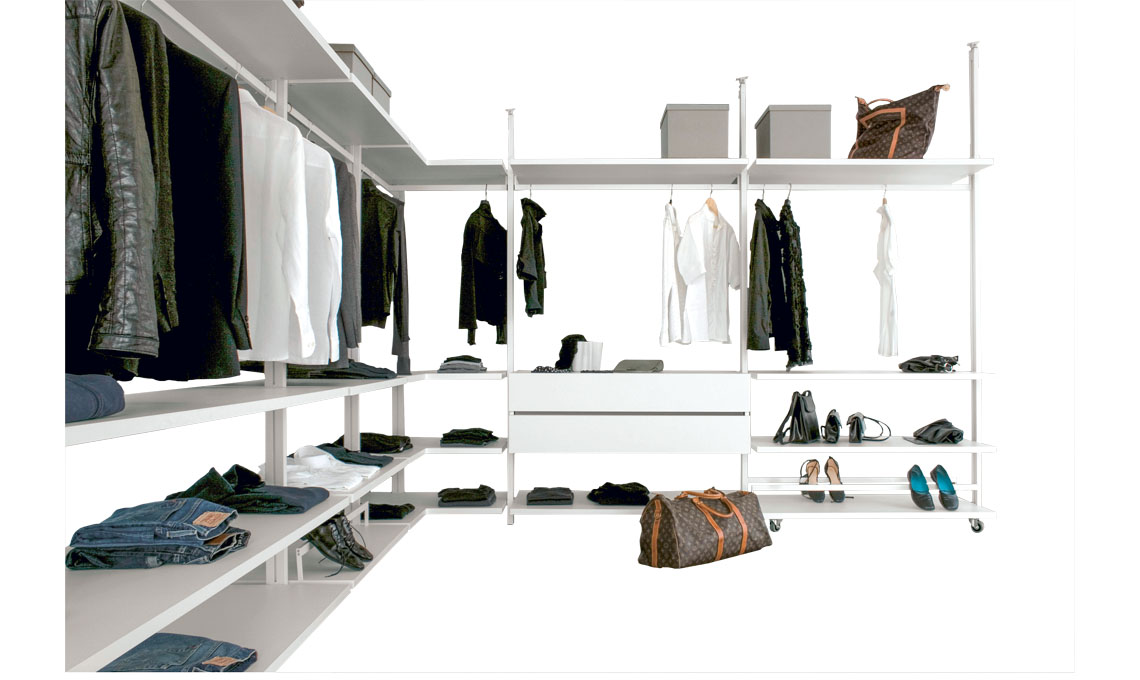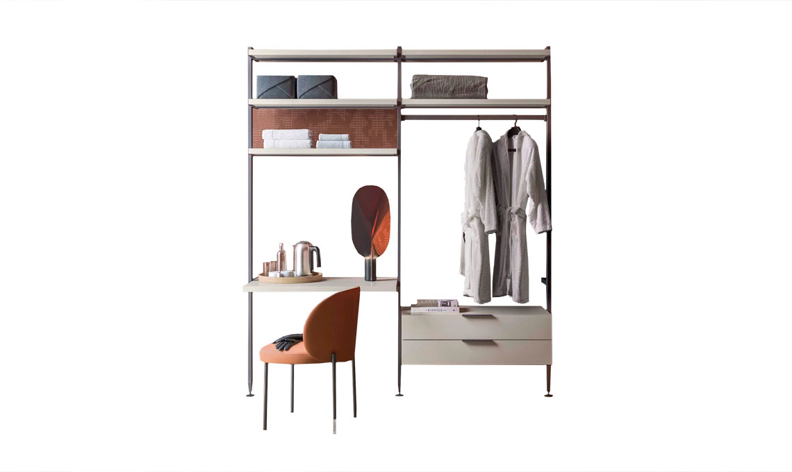 • Può essere elegante o informale, di sicuro visivamente leggera perché è composta solo da pali metallici con funzione portante a cui viene agganciata l’attrezzatura del guardaroba. Questa viene posizionata lungo i profili preforati, senza dover occupare necessariamente lo spazio a terra e potendone sempre modificare la disposizione al cambiare delle esigenze.