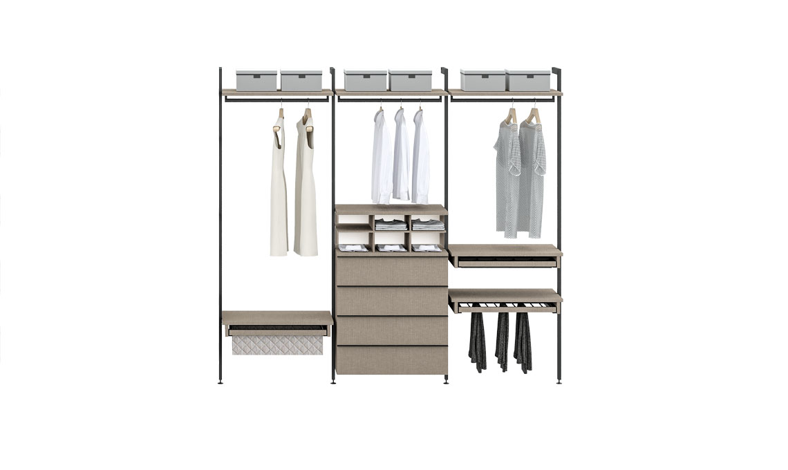 • Dispone di moduli di larghezza molto variabile, che partono da 40-50 cm per ritagliarsi più zone guardaroba separate e con profondità di 35-40 cm per inserirsi nei mini-spazi di disimpegni e ripostigli.