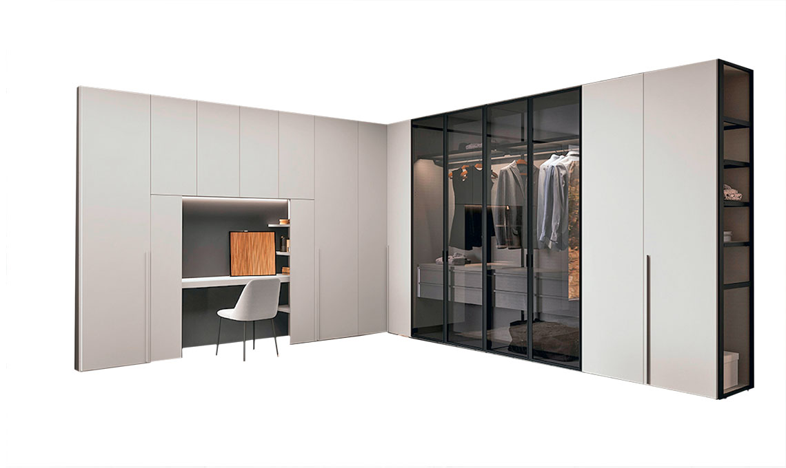 • Altamente modulare, è l’ideale per sfruttare al massimo gli spazi anche fuori dalla camera da letto, potendo integrare le nicchie con scrivanie, vani a giorno, ante con televisore incorporato, moduli ad angolo con cabina spogliatoio o per inserire contenitori nelle parti terminali.