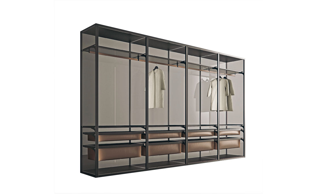 • È ideale per chi cerca una versione più leggera della cabina a spalla o vuole un armadio dall’effetto teca, protetto da ante e fianchi vetrati e con attrezzatura illuminata.