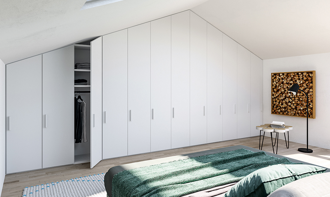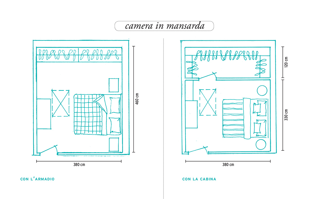 La posizione della porta impone l’inserimento sulla parete di fronte di sistemi che seguano la pendenza del tetto. Qui l’altezza minima di cm 150 è in corrispondenza della testata del letto, l’altezza massima, sul lato opposto, è di cm 300, quindi l’armadio ha un solo spiovente.