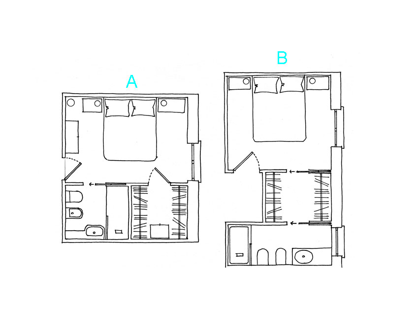 Nella soluzione A la cabina viene ricavata in camera, di fronte al letto, così da fare spazio anche a un secondo bagno. Nella soluzione B la cabina è organizzata nel ripostiglio e diventa passante tra camera e bagno.