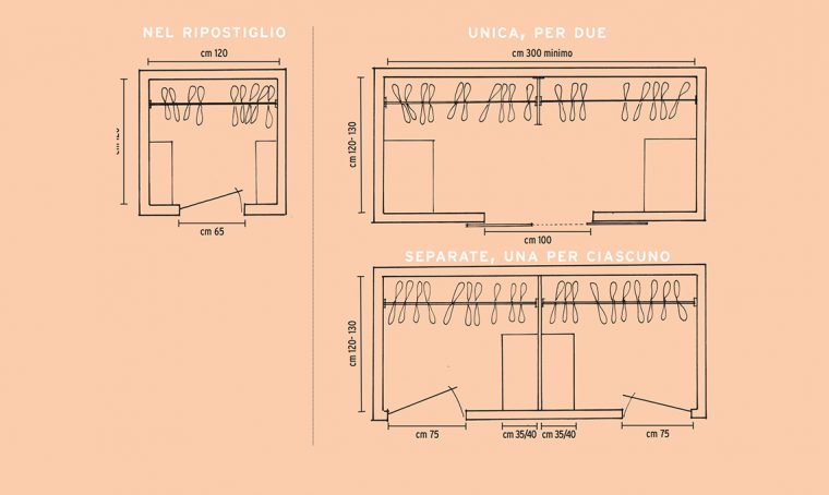 Ecco due progetti per la cabina su due lati attrezzata per due paersone. Nel progetto A è organizzata in uno spazio quasi quadrato all’interno di una camera in cui è stato ricavato anche un secondo bagno (appenderia ai lati più cassettiera in fondo). Nel progetto B il ripostiglio diventa cabina passante tra camera e bagno (questa soluzione è attuabile solo se in casa esiste un altro bagno accessibile dalla zona giorno).